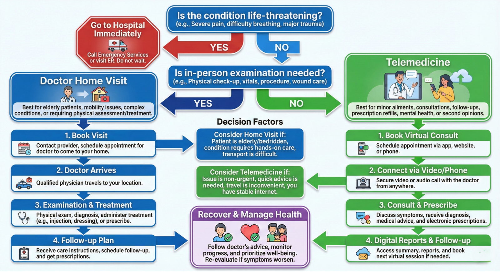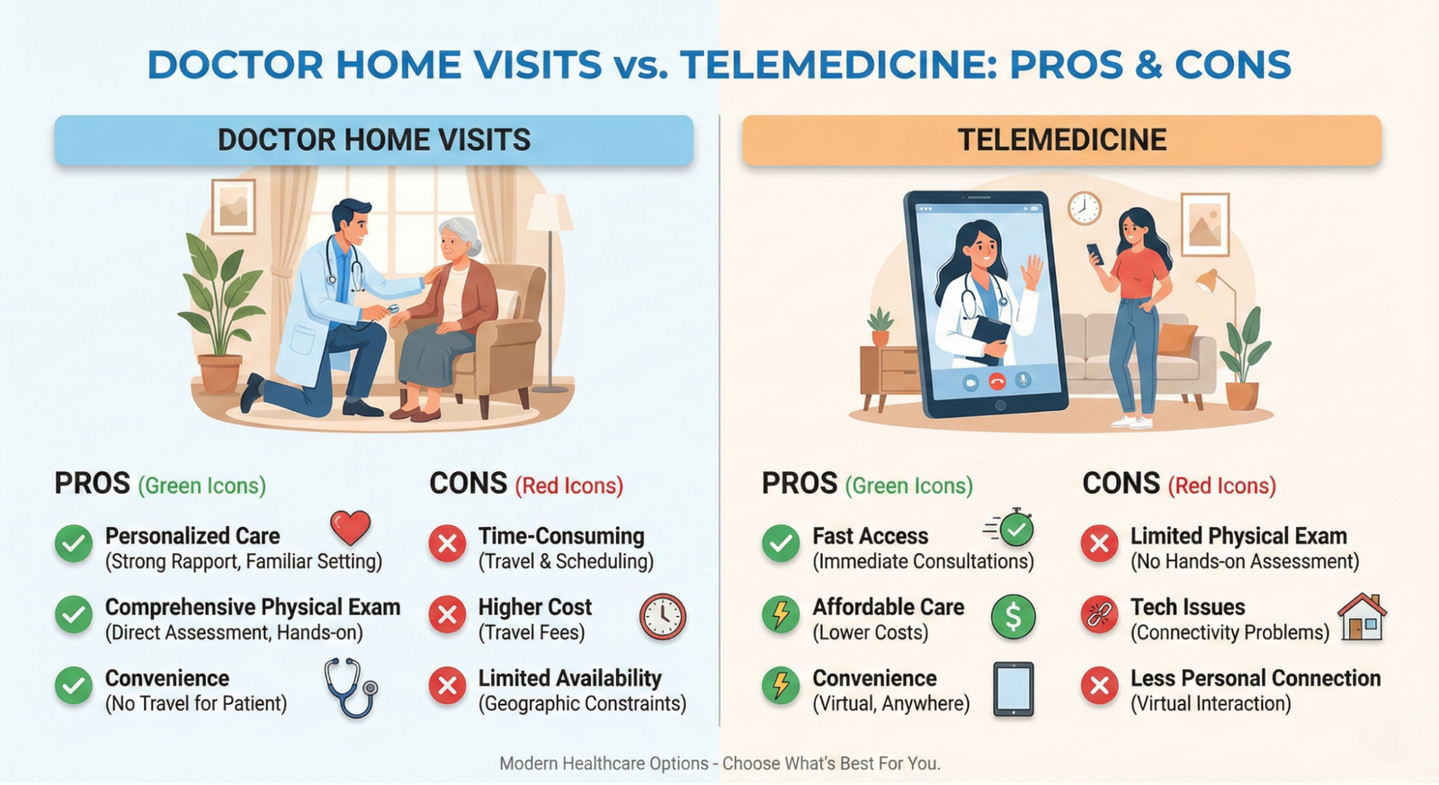 Best For | Elderly, bedridden, serious checkups | Minor issues, quick follow-ups, mental health |
